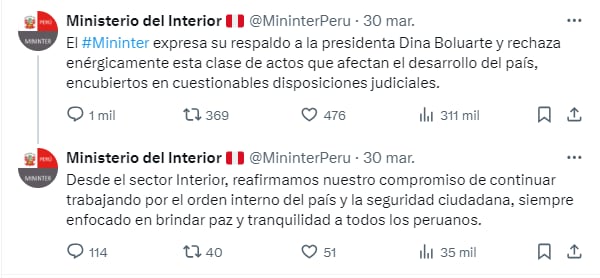 “El Mininter expresa su respaldo a la presidenta Dina Boluarte y rechaza enérgicamente esta clase de actos que afectan el desarrollo del país, encubiertos en cuestionables disposiciones judiciales”, posteó en X (Twitter) dicho portafolio. ¿Acaso el Ministerio del Interior, mediante la Diviac, no participó en la diligencia? Cuál será el criterio para apoyar una institución (la Presidencia) en desmedro de otras dos (el PJ y la Fiscalía). Deplorable