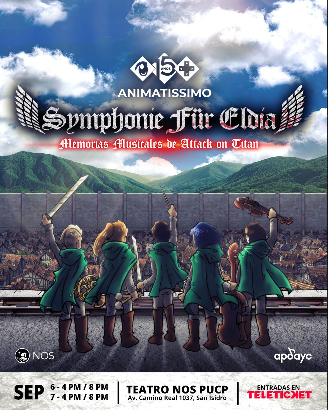 Los fanáticos de Attack on Titan tendrán una cita única con la música que marcó a toda una generación. Animatissimo, la productora pionera en conciertos sinfónicos de anime y videojuegos en Perú, presentará Symphonie für Eldia – Memorias musicales de Attack on Titan los días sábado 6 y domingo 7 de septiembre, en doble horario (4:00 p. m. y 8:00 p. m.), en el Teatro NOS PUCP.
