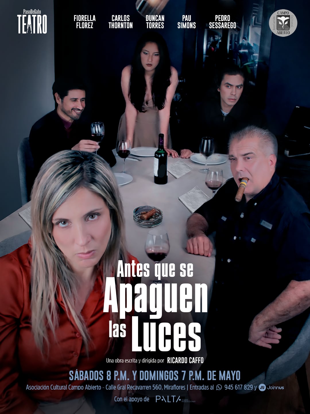 La obra teatral “Antes que se apaguen las luces”, escrita y dirigida por Ricardo Caffo, se presentará durante el mes de mayo en la Asociación Cultural Campo Abierto, ubicada en el distrito limeño de Miraflores. La puesta en escena, producida por Paso de Gato Teatro, propone una mirada íntima a las dinámicas familiares frente a una revelación inesperada.