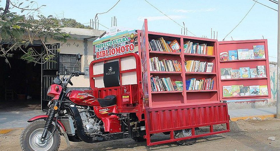 La "Bibliomoto" nació a raíz de una biblioteca que nosotros teníamos en el Asentamiento Humano Santo Domingo. Durante el tiempo que yo estuve en España, vi un "Biblio bus" que iba a los colegios entonces, cuando retorné a Perú dije: "Bueno en Huarmey, no haré unBiblio bus pero haré una "Bibliomoto". Entonces, la mototaxi que manejaba mi hijo lo convertimos en la "bibliomoto".