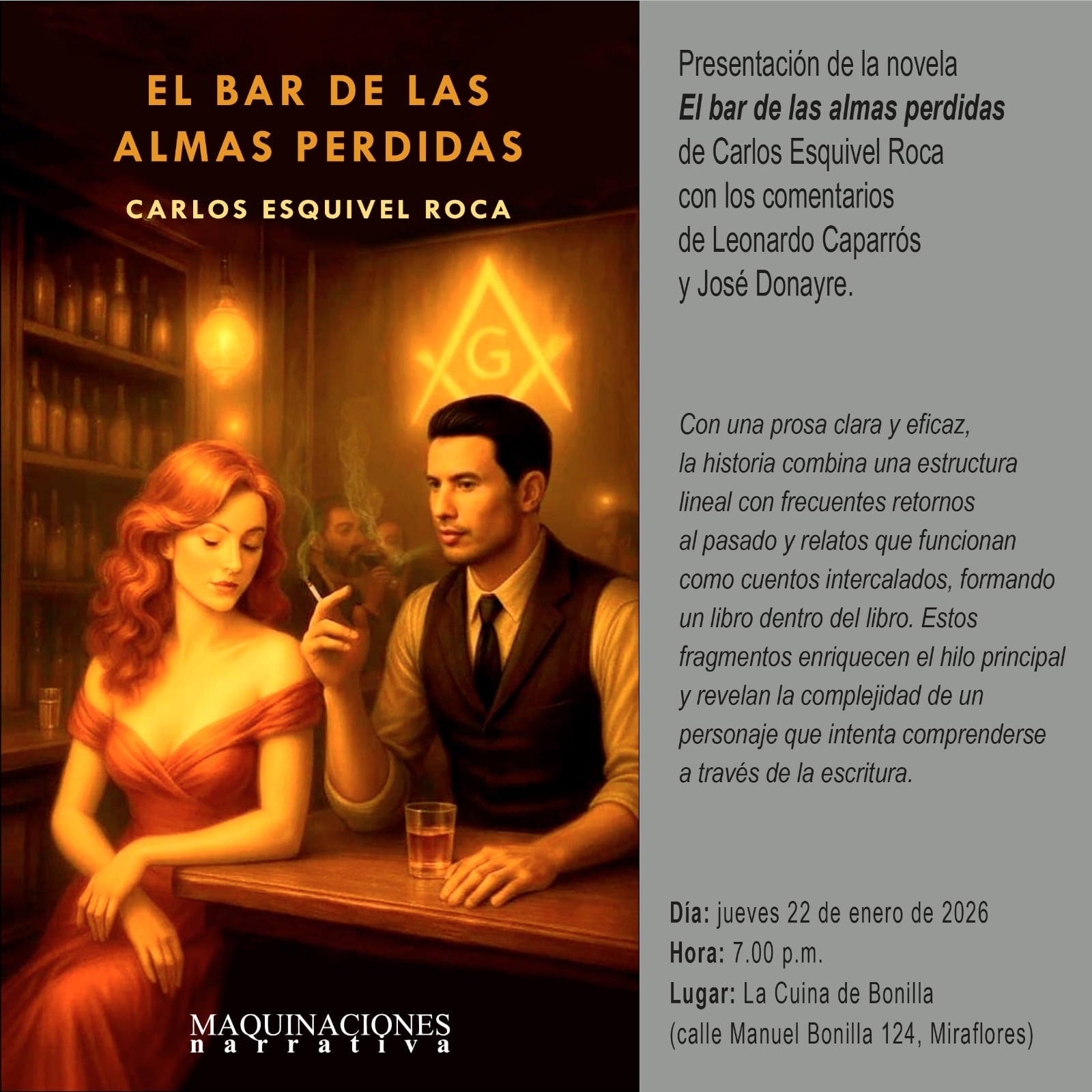 El escritor peruano Carlos Esquivel Roca publica su más reciente novela El bar de las almas perdidas, un relato marcado por giros narrativos, viajes y encuentros en escenarios donde el peligro y la revelación parecen latir de manera constante.