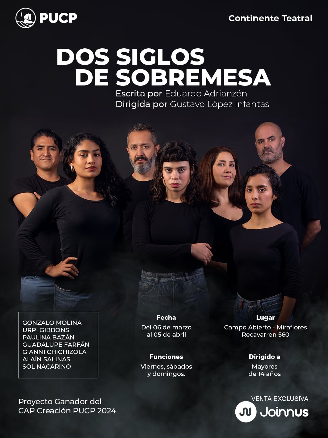 “Dos siglos de sobremesa” se estrena el viernes 6 de marzo a las 8:00 p.m. en Campo Abierto, ubicado en Calle General Recavarren 560, Miraflores. Las entradas ya están disponibles en Joinnus y en la recepción del teatro, 30 minutos antes de cada función.