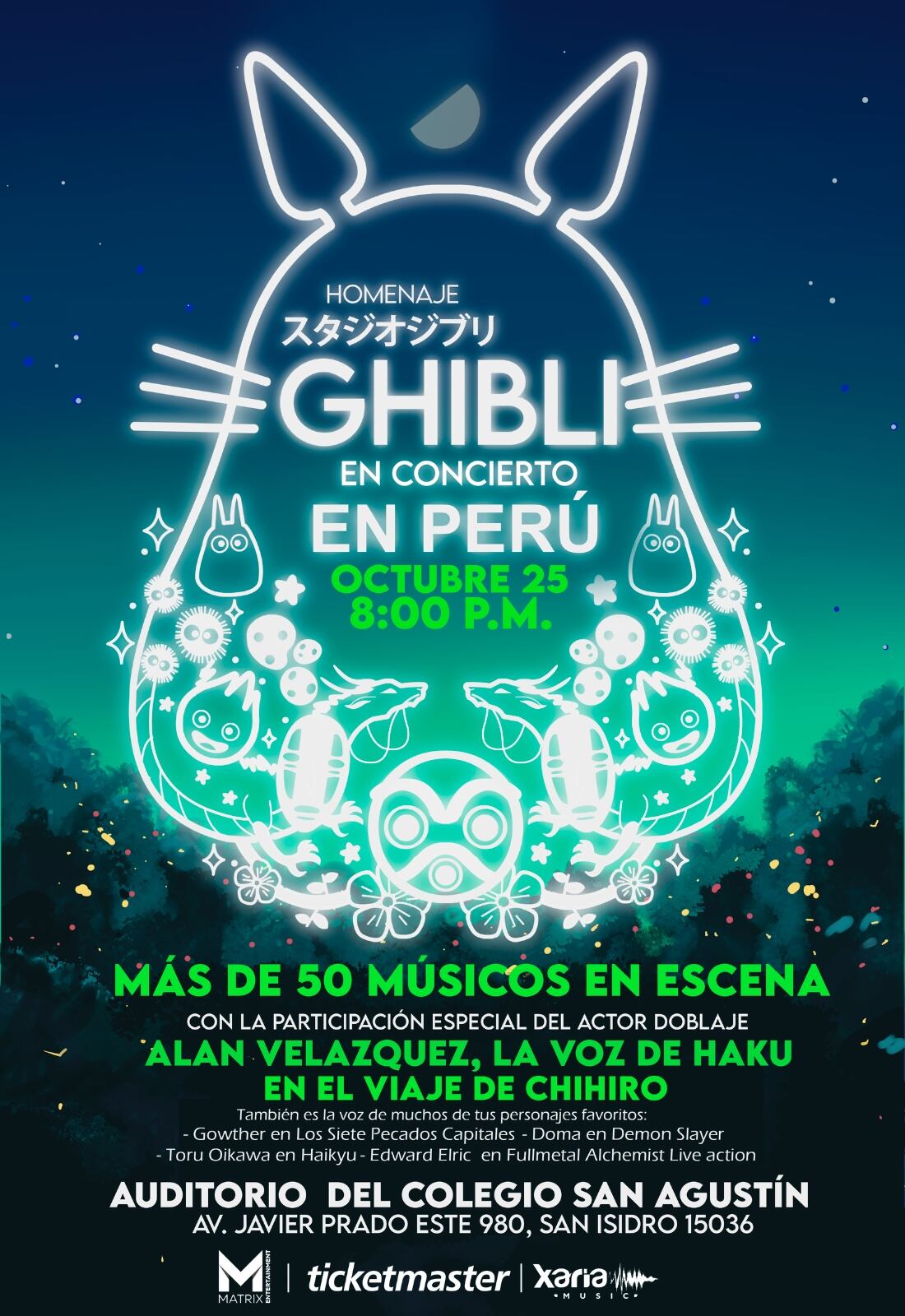 Este sábado 25 de octubre a las 8:00 p.m., Lima vivirá un espectáculo sin precedentes con Ghibli en Concierto: La magia del anime y los videojuegos, un show sinfónico que promete transportar al público a los universos más entrañables del Studio Ghibli. El evento se realizará en el Auditorio del Colegio San Agustín (Av. Javier Prado Este 980, San Isidro) y las entradas ya están disponibles en Tickemaster.