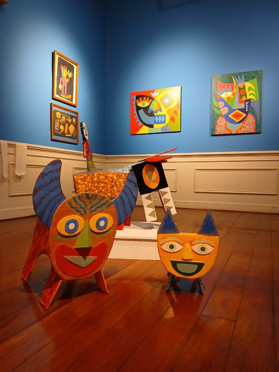 La curaduría exhibe trabajos en dibujo, collages, bordados, tapices, ensamblajes, estampados textiles y animaciones digitales, revelando un estilo que combina tradición, reciclaje y experimentación cultural. Inspirado en una reinterpretación del “primitivismo” occidental, Rodríguez transforma piezas únicas en objetos utilitarios e imaginativos.