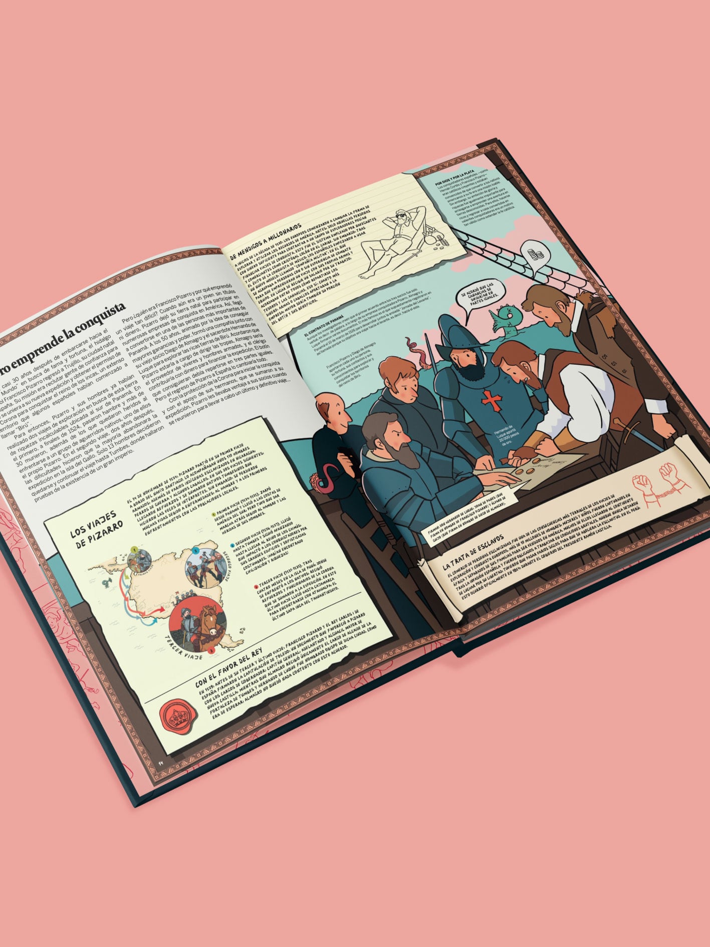 Mi trabajo como asesor en historia es precisamente asegurarme de que la información que se presenta es acorde con lo que los historiadores del periodo manejamos. Hay una redactora, Yesenia Silva; una ilustradora, Melissa Siles; y otras personas como Adriana Roca, Pati Villanueva y Ricardo Kusunoki, todos enfocados en la precisión del texto.