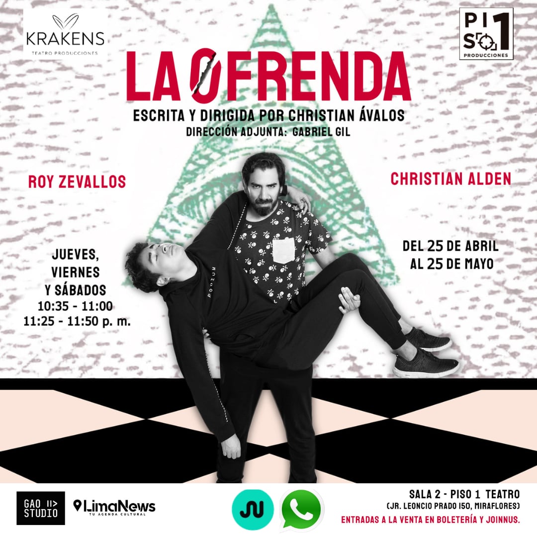 Las funciones serán del 25 de abril al 25 de mayo, de jueves a sábados en el horario Trasnoche: 10:35 - 11:00 - 11:25 - 11:50 p. m. en la SALA 2 de Piso 1 Teatro (Jr. Leoncio Prado 150, Miraflores). Las entradas se pueden adquirir en la boletería del teatro, a través del WhatsApp 993486978: https://wa.link/hs4e8y y en Joinnus: https://www.joinnus.com/events/theater/lima-la-ofrenda-sala-2-61400.