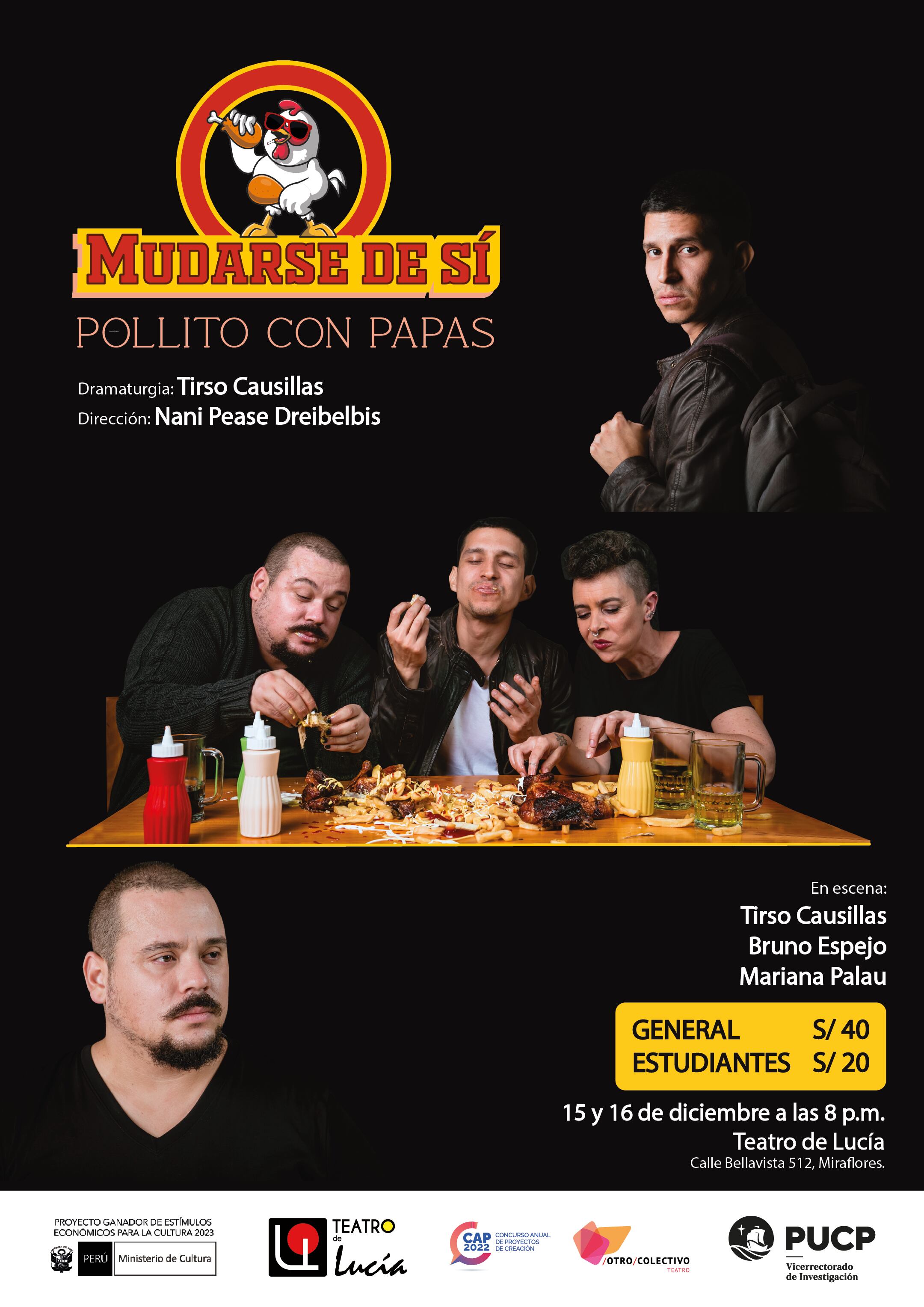 Luego de presentarse en distintos lugares (el LUM, Vichama y el Teatro de Lucía) y de tener una gran acogida del público, “Mudarse de sí (pollito con papas)” regresa por dos únicas funciones cerrando el 2023 en el teatro de Lucía este viernes 15 y sábado 16 de diciembre a las 8pm.