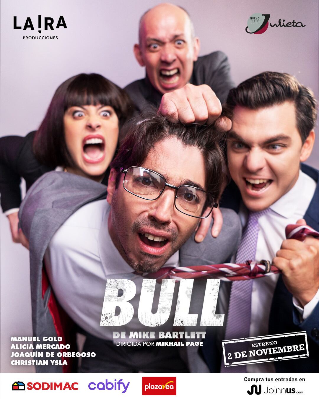 LA IRA Producciones cierra este 2023 con el reestreno de la afilada comedia “Bull” de Mike Bartlett, dirigida por Mikhail Page, que contará con el elenco conformado por Manuel Gold, Alicia Mercado, Joaquín de Orbegoso y Christian Ysla. La corta temporada de Bull se presentará del 2 al 26 de noviembre en el Nuevo Teatro Julieta, ubicado en Pasaje Porta 132, Miraflores.