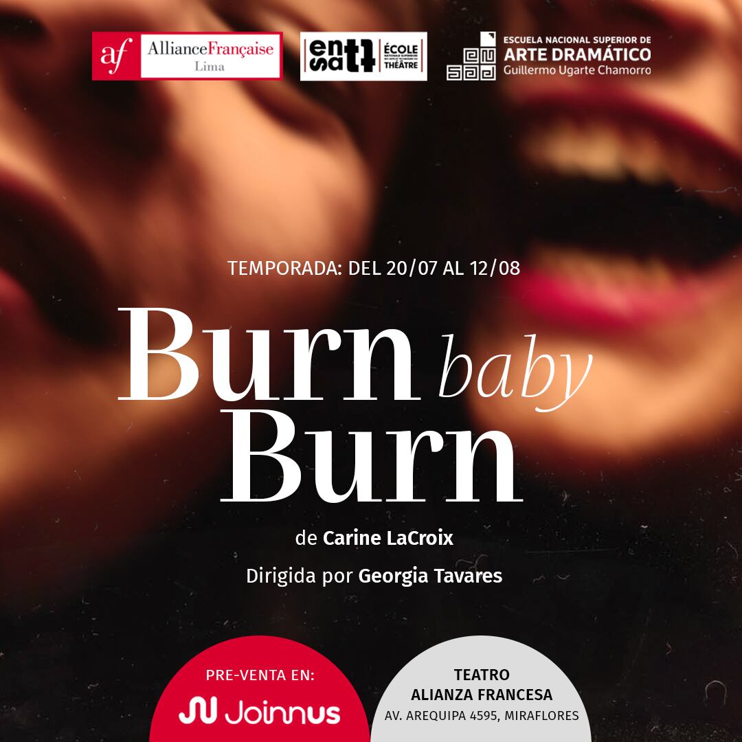 Se estrena en el Teatro de la Alianza Francesa de Lima la obra Burn Baby Burn, de la dramaturga francesa Carine Lacroix, bajo la dirección de Georgia Tavares (Brasil/Francia), una coproducción franco-peruana de tres instituciones culturales: la Alianza Francesa de Lima, la Escuela Nacional Superior de Arte Dramático Guillermo Ugarte Chamorro de Perú (ENSAD) y la Escuela nacional de las Artes y Técnicas del Teatro de Lyon (ENSATT, Francia). La obra se estrenará el 20 de julio a las 8:00 p.m. en el teatro de la Alianza Francesa.
