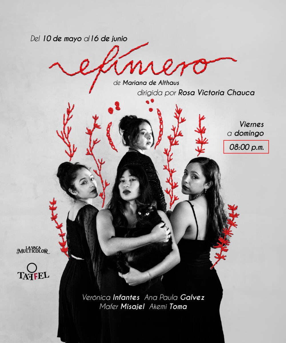 La Asociación Cultural La Vaca Multicolor y el TAFFEL de Fernando Luque presentan por una corta temporada “Efímero”, dramaturgia de Mariana de Althaus, bajo la dirección de Rosa Victoria Chauca. La corta temporada de solo seis funciones va del viernes 10 de mayo al domingo 16 de junio en el teatro de cámara del centro cultural ubicado en Lince (Av. César Canevaro 116, oficina 1301).