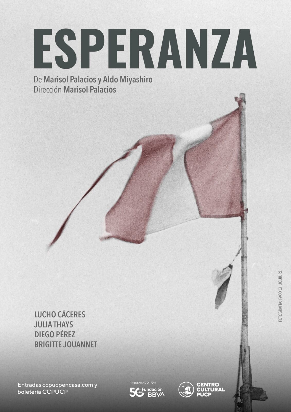 El Centro Cultural de la Pontificia Universidad Católica del Perú, junto a Fundación BBVA, en el marco de su 50 aniversario en el Perú, presenta su segunda producción del año: Esperanza de Marisol Palacios y Aldo Miyashiro, bajo la dirección de Marisol Palacios. Esta nueva obra de dramaturgia peruana es llevada a escena por Lucho Cáceres, Julia Thays, Diego Pérez y Brigitte Jouannet, quienes dan vida a un drama con toques de comedia ambientado en Lima, en los convulsionados años 80 e inspirado en un episodio de la vida real.