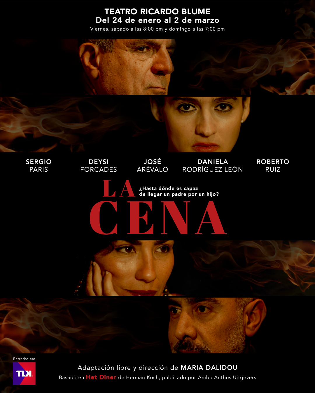 Se estrena “La Cena”, ácida y provocadora obra de teatro basada en la novela de Herman Koch, HET DINER, adaptación libre de la dramaturga y directora del montaje, María Dalidou. El elenco está conformado por Daniela Rodríguez León, Deysi Forcades (Cuba), Roberto Ruiz, Sergio Paris (Argentina) y José Arévalo. La obra se presentará del viernes 24 de enero al domingo 02 de marzo en el Teatro Ricardo Blume (Jr. Huiracocha 2160, Jesús María).