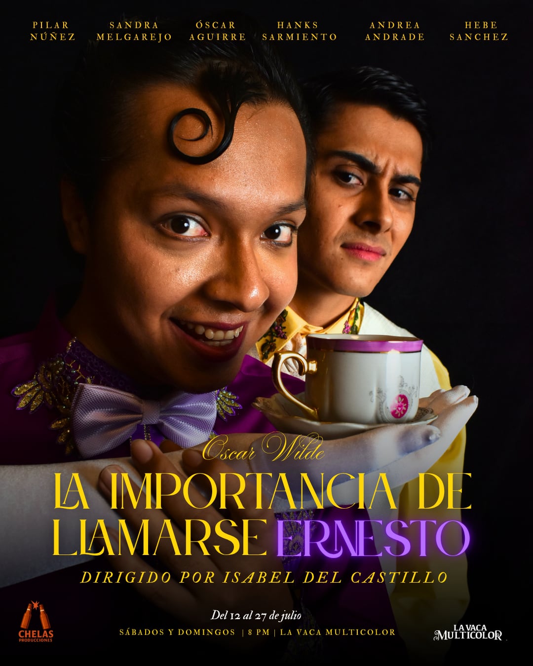 La propuesta de Chelas Producciones, en colaboración con La Vaca Multicolor, no solo respeta la agudeza del texto original, sino que lo revitaliza con una puesta fresca, ágil y desvergonzadamente divertida. “Wilde escribe con una gracia feroz, con una prosa que no necesita ser enredada para ser profunda. Su humor es elegante, descarado, y habla de nosotros aunque finjamos que no. Nos cautiva, con esa sensualidad y je ne sais quoi que todos llevamos dentro. Con esta versión busco crear una atmósfera especial para el público y redefinir, juntos, la idea del teatro clásico como algo cercano y vital” finaliza Isabel del Castillo, directora de la obra, quien inició su formación en los talleres de Fernando Luque y reconoce en esta obra un desafío actoral que siempre deseó llevar a escena: un texto que no teme desabotonarse el cuello para sonrojar —y seducir— al público. La obra estrena el próximo sábado 12 de julio, por seis únicas funciones, en el teatro de La Vaca Multicolor, ubicado en la Av. Canevaro 116, int. 1301 en Lince.