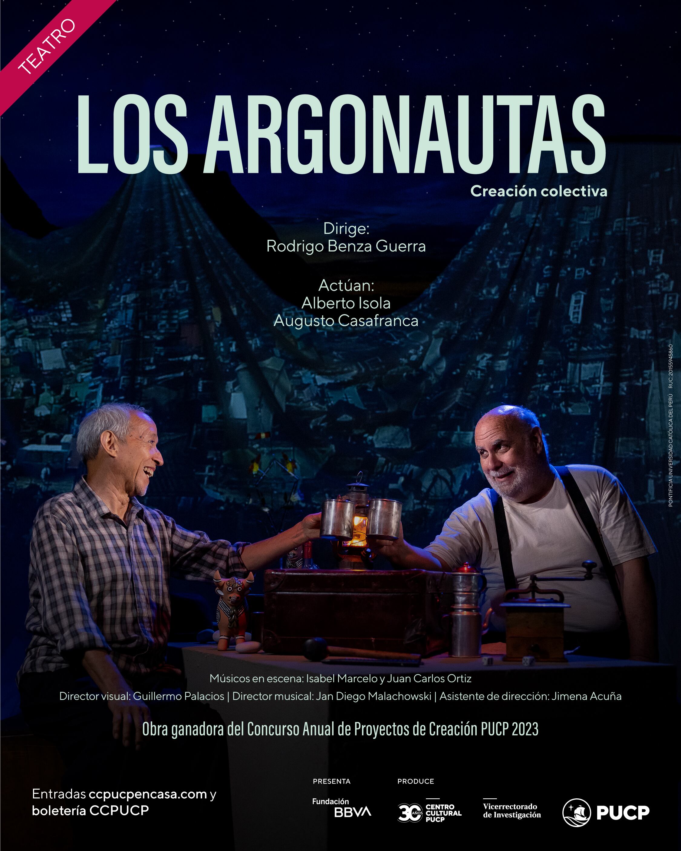 En el marco de su 30 aniversario, el Centro Cultural PUCP, junto a la Fundación BBVA, presentan LOS ARGONAUTAS, obra ganadora del Concurso Anual de Proyectos de Creación PUCP 2023 del Vicerrectorado de Investigación PUCP. Creación colectiva, escrita y dirigida por Rodrigo Benza Guerra, está protagonizada por Alberto Isola y Augusto Casafranca, dos grandes talentos del teatro peruano que por primera vez comparten escenario.