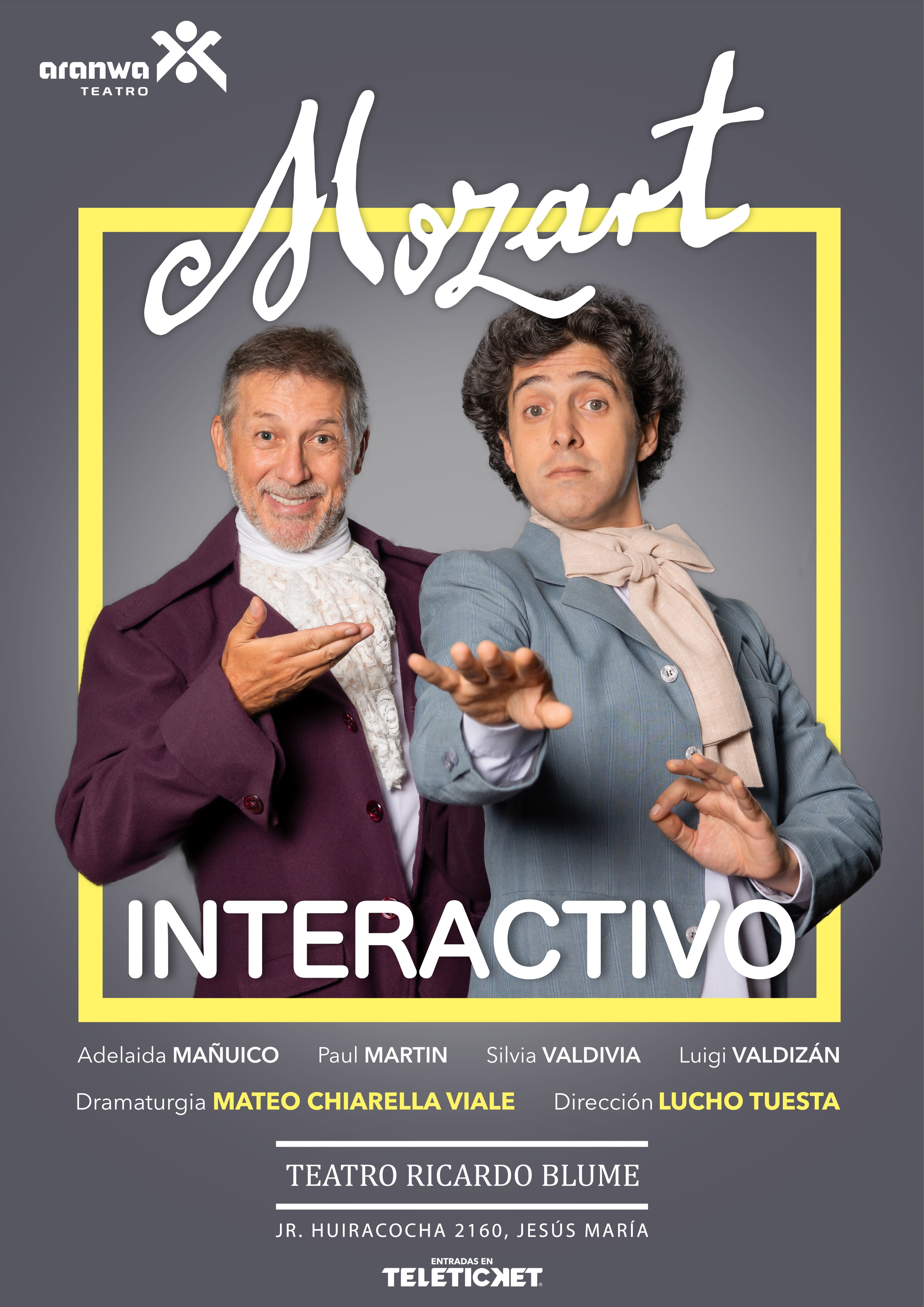Desde el viernes 5 de abril se presentará la obra de teatro musical “Mozart interactivo” escrita por Mateo Chiarella, dirigida por Lucho Tuesta, que contará con la participación de Paul Martin, Luigi Valdizán, Adelaida Mañuico y Silvia Valdivia en el Teatro Ricardo Blume (Jr. Huiracocha 2160, Jesús María). Entradas en Teleticket.