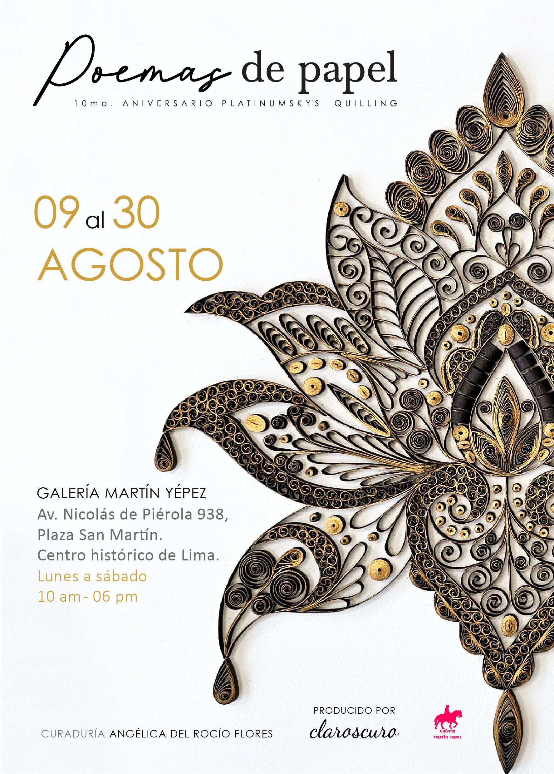Una habitación oscura se ilumina de pronto con colores, texturas y creatividad: así comienza el viaje sensorial de “Poemas de Papel”, la exposición que del 9 al 30 de agosto transformará la sala del segundo piso de la Galería Martín Yépez en un homenaje al arte en filigrana. Esta muestra colectiva celebra los 10 años de trayectoria de Katheryne Talledo y su escuela Platinumsky’s Quilling, que ha formado a decenas de artistas en Perú y el extranjero.