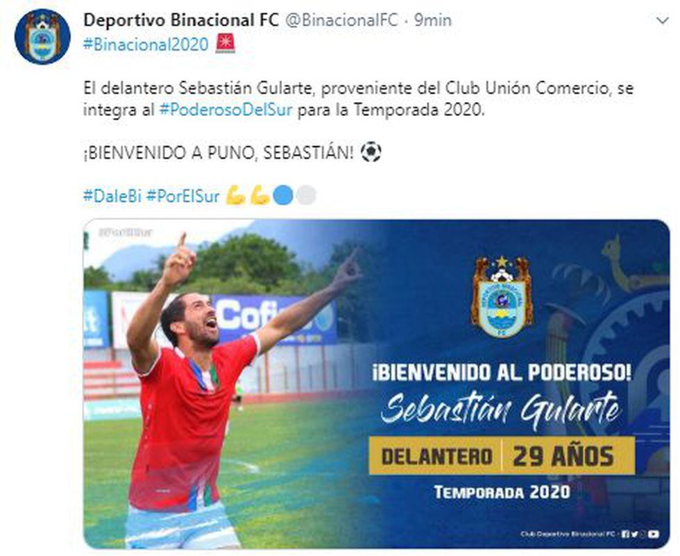 “El delantero Sebastián Gularte, proveniente del Club Unión Comercio, se integra al #PoderosoDelSur para la temporada 2020. ¡BIENVENIDO A PUNO, SEBASTIÁN!”, fue el mensaje de bienvenida de Binacional en redes sociales.