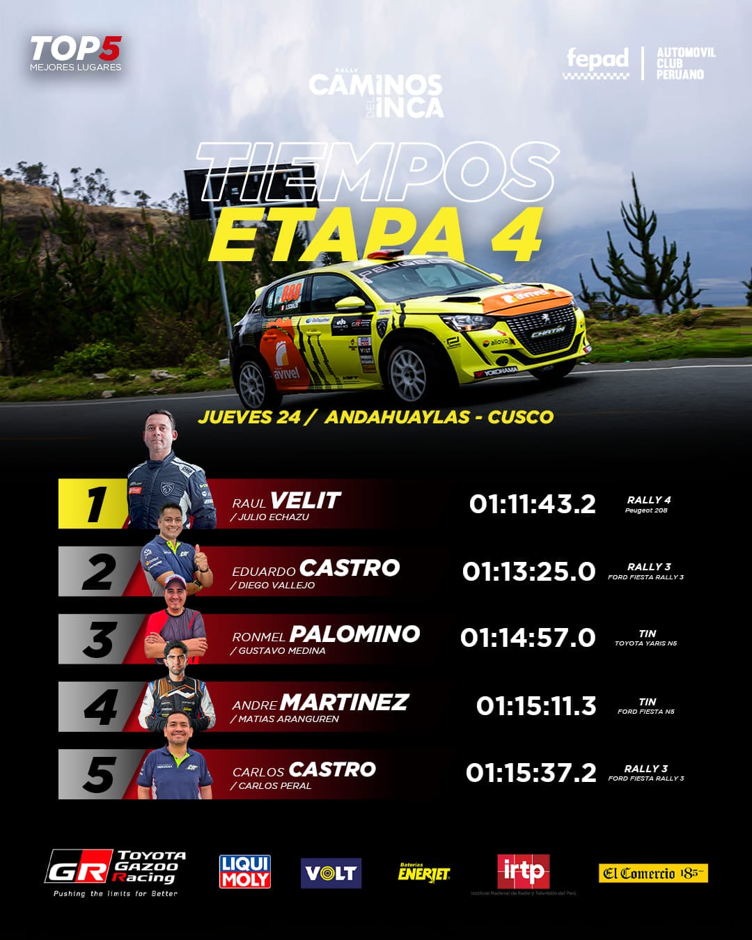 De momento el Castro Yangali Team se mantiene en en la punta de la clasificación, con una ventaja de 13:11 minutos sobre Raúl Velit, y más de 24 minutos sobre el tercero, André Martínez.