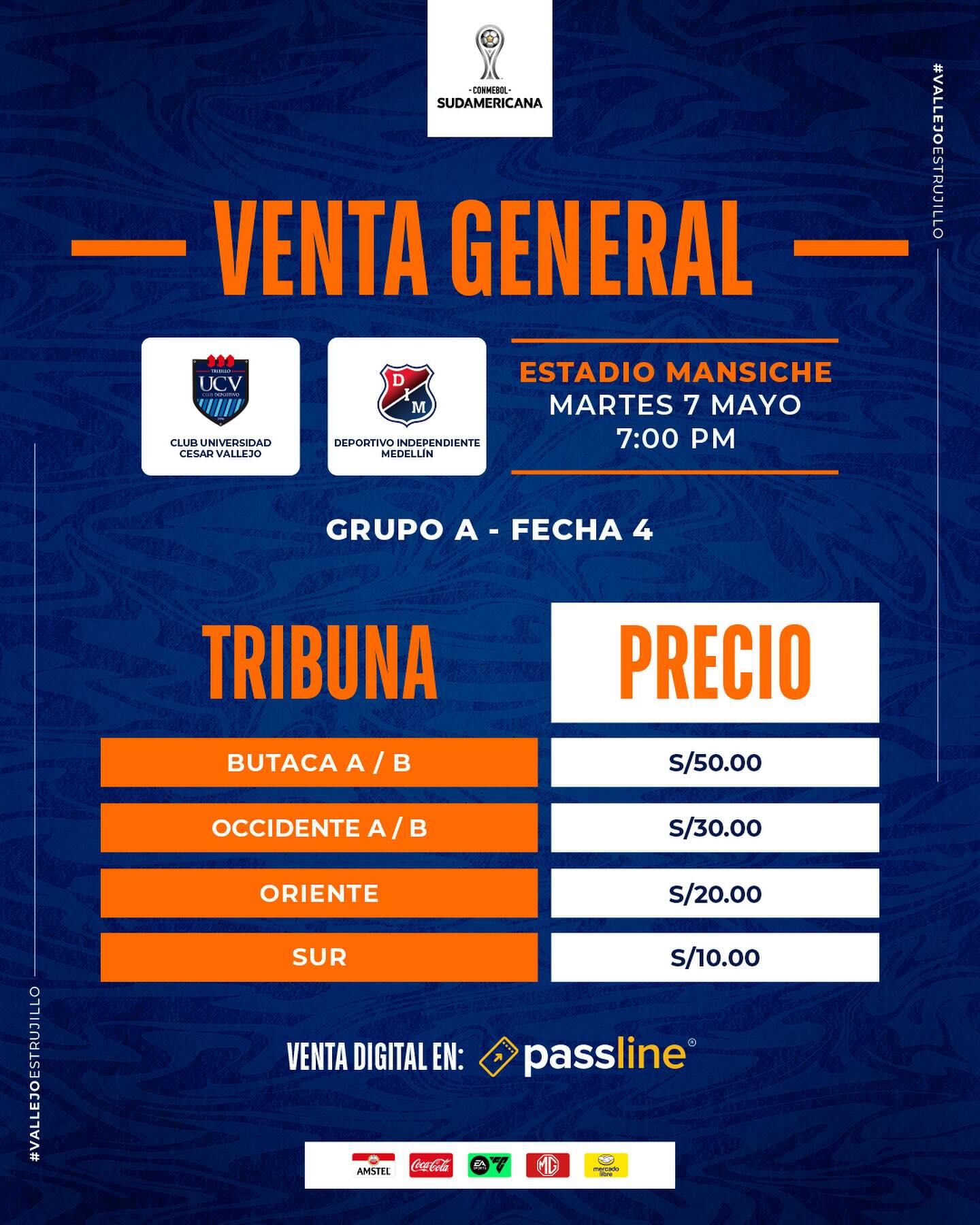 La Universidad César Vallejo recibirá este martes 7 de mayo a Deportivo Independiente Medellín (DIM), por la cuarta fecha del Grupo A de la Copa Sudamericana. El cotejo irá desde las 7:00 de la noche en el Estadio Mansiche.