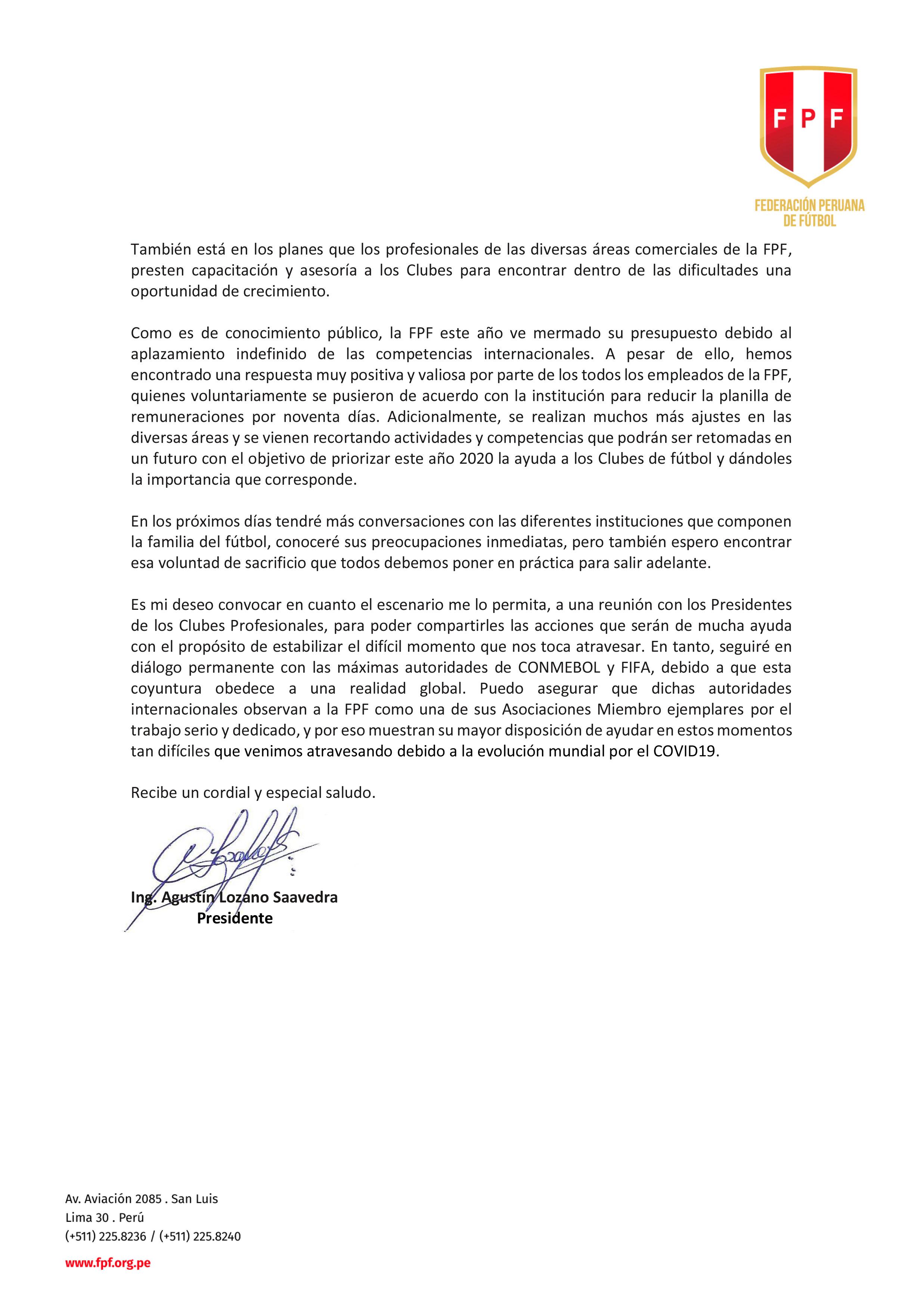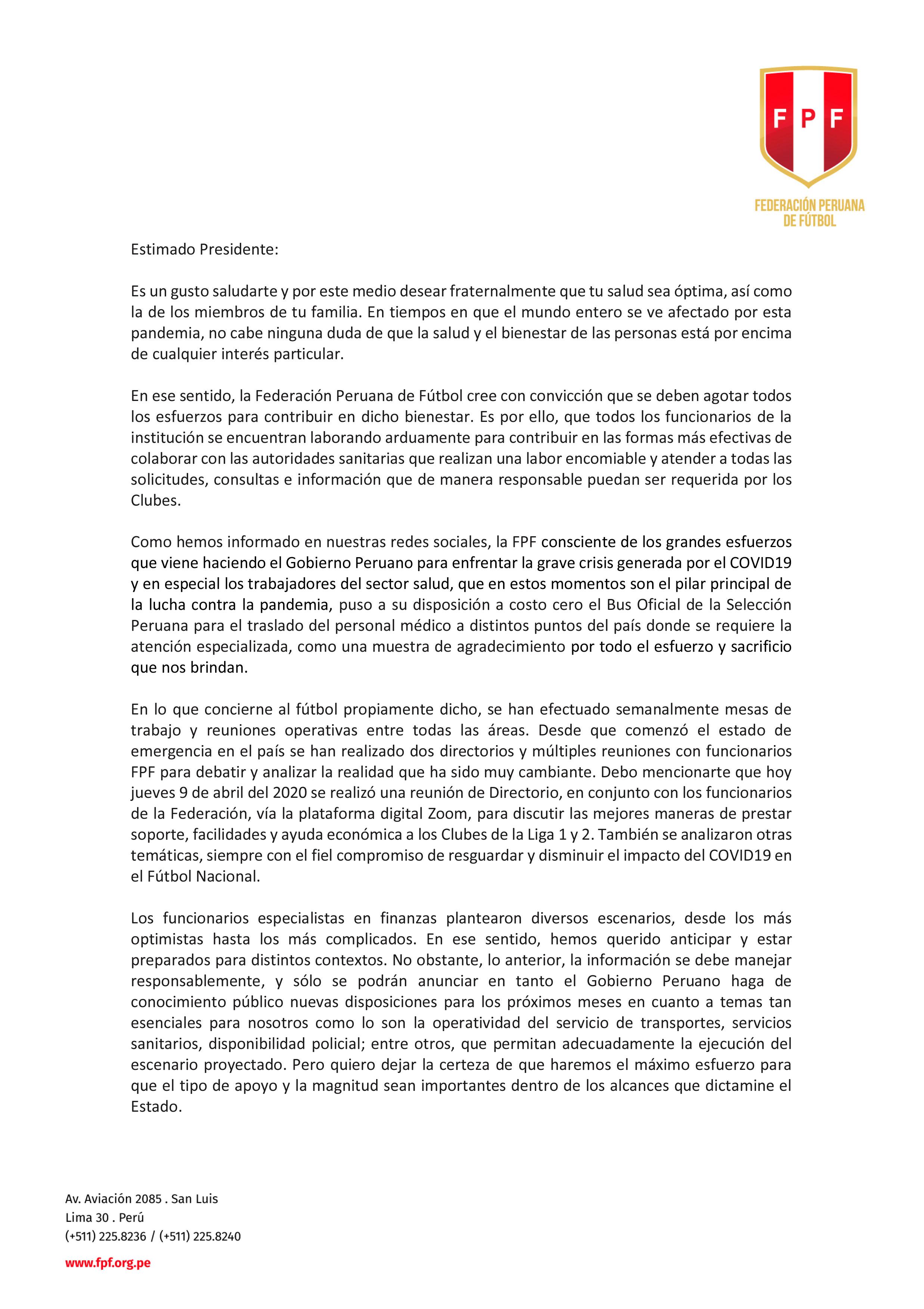 “Debo mencionarte que hoy jueves 9 de abril del 2020 se realizó una reunión de Directorio, en conjunto con los funcionarios de la Federación, vía la plataforma digital Zoom, para discutir las mejores maneras de prestar soporte, facilidades y ayuda económica a los Clubes de la Liga 1 y 2. También se analizaron otras temáticas, siempre con el fiel compromiso de resguardar y disminuir el impacto del COVID19 en el Fútbol Nacional”, se lee en la misiva.