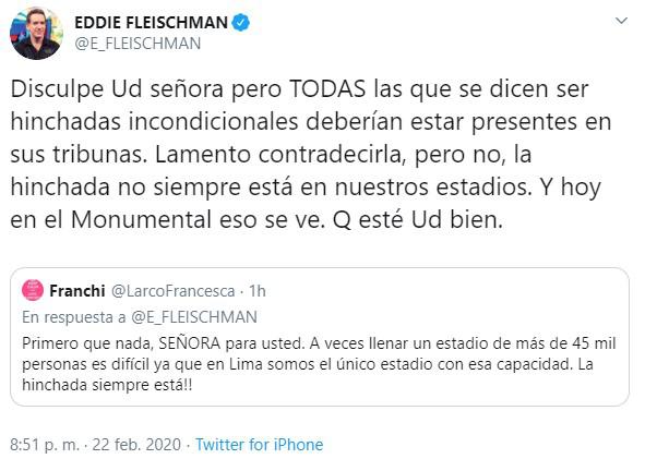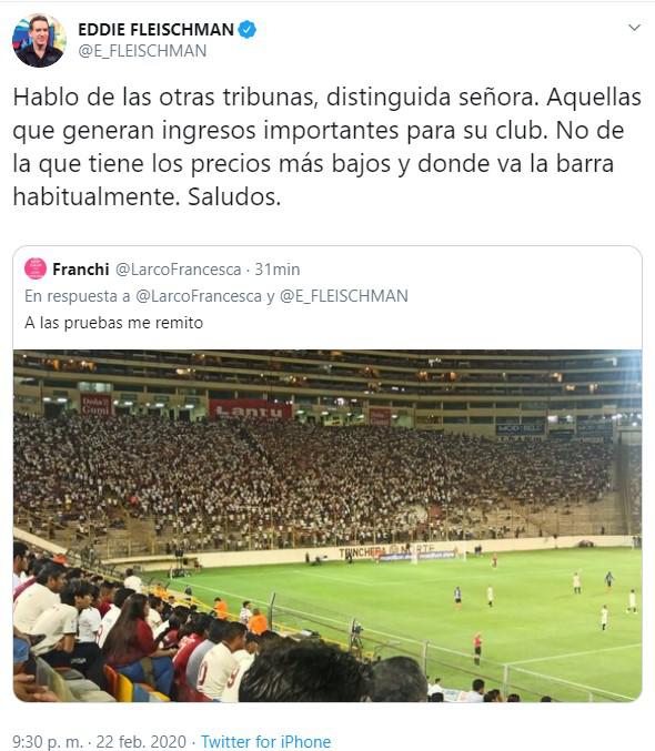 Tras lo escrito por Eddie Fleischman, hinchas de Universitario se mostraron en contra. Tal como una usuaria que asistió al partido contra César Vallejo. Ella le pidió al periodista informarse más sobre la cantidad de personas que fueron para ver el espectáculo.
