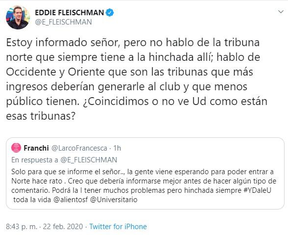 El periodista deportivo Eddie Fleischman cuestionó mediante su cuenta de Twitter la poca presencia de la hinchada de Universitario de Deportes en las tribunas de oriente y occidente del estadio Monumental, donde se disputó el duelo contra la Universidad César Vallejo por la fecha 4 del Torneo Apertura.