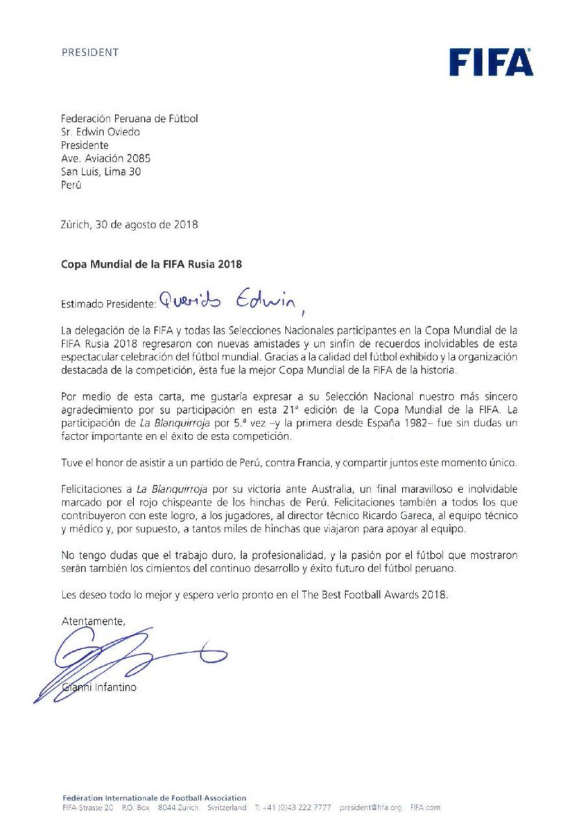 El presidente de la FIFA, Gianni Infantino, envió una misiva en nombre de la institución que preside a la Federación Peruana de Fútbol para agradecerle su participación en el Mundial de Rusia 2018.