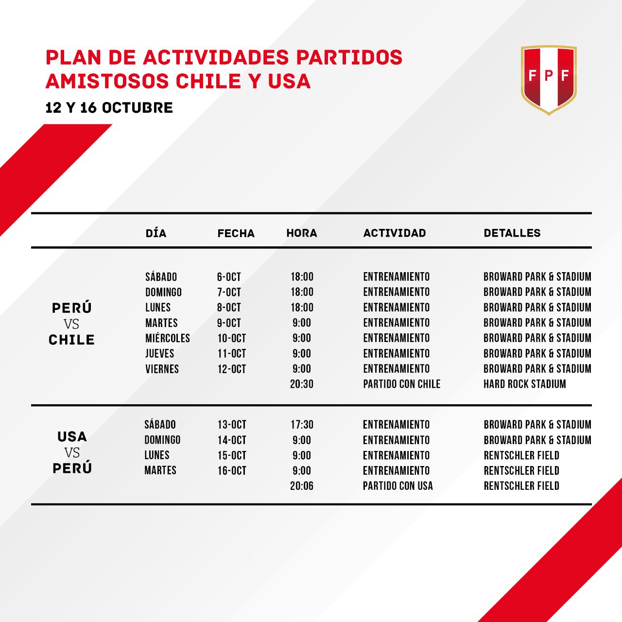 Perú disputará un primer encuentro contra Chile, su rival tradicional en el Pacífico sudamericano, el viernes 12 de octubre en Miami, y cuatro días después jugará ante Estados Unidos en East Hartford, Connecticut.