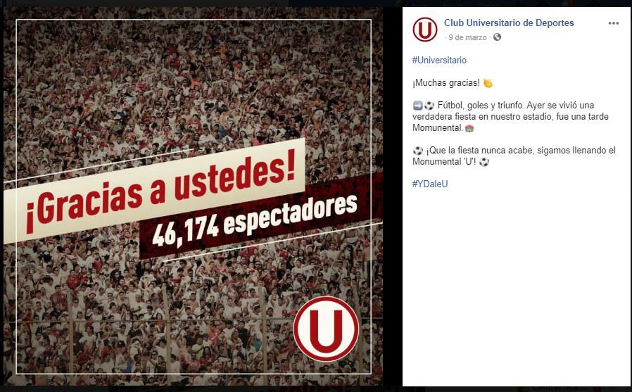 Los más de 52 mil espectadores anunciados por la Liga de Fútbol Profesional a través de sus redes sociales, dista de lo que publicó Universitario de Deportes hace unos días en las que comunicó que al coloso de Ate llegaron 46 174 espectadores.