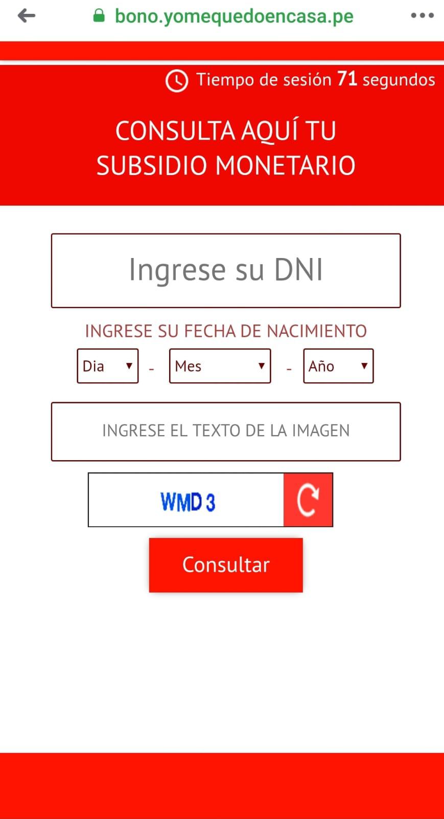 Luego debe colocar el número de su DNI, fecha de nacimiento y el código de seguridad que aparece como imagen, así podrá consultar si le corresponde el subsidio monetario.