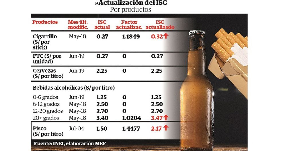 Ello, según explicó a Correo el viceministro de Economía, Mario Arróspide, considera el Índice de Precios al Consumidor (IPC) de cada bien, y será aplicada a un grupo determinado de productos, que son a los que se aplica el sistema específico (valor por unidad): cigarrillos, cerveza, bebidas alcohólicas y combustibles.