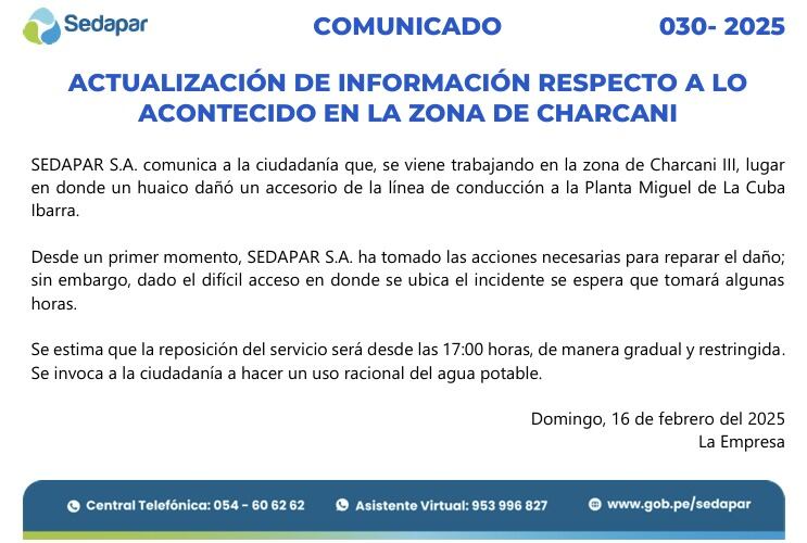 En su último comunicado, Sedapar informó que los trabajos de reparación de la tubería dañada podrían culminar hoy, lo que permitiría el restablecimiento gradual del servicio desde las 5 de la tarde.