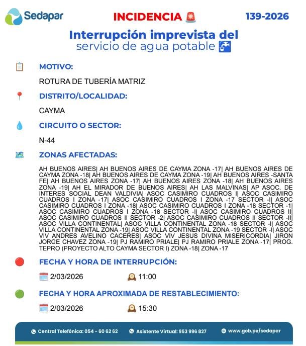 De acuerdo a la comunicación de Sedapar a través de sus redes, ayer se registró la rotura de una tubería matriz que afectó el circuito N-44, perjudicando a más de 30 urbanizaciones.