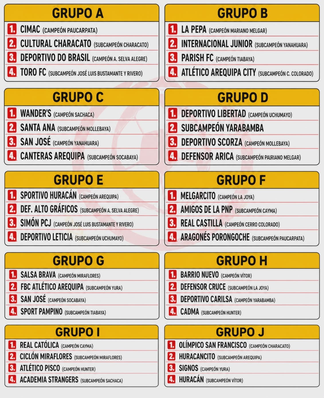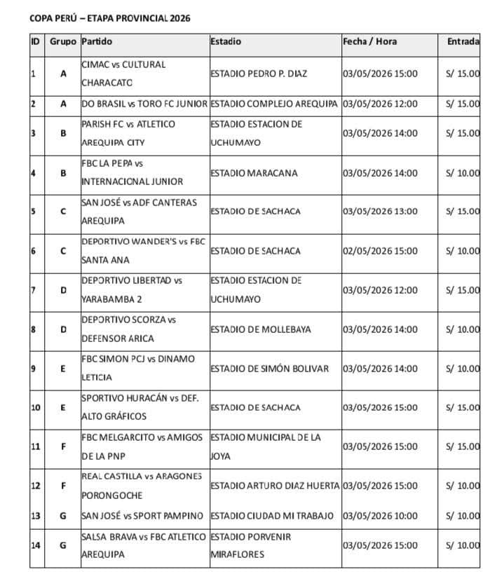 La Liga Provincial de Fútbol de Arequipa realizó anoche el sorteo oficial del fixture para la etapa Provincial de la Copa Perú, certamen que se disputará del 1 de mayo al 21 de junio. En esta instancia participarán 40 equipos, correspondientes a los 20 campeones y 20 subcampeones de las ligas distritales de Arequipa. La organización confirmó que el torneo contará con cuatro fases competitivas.
