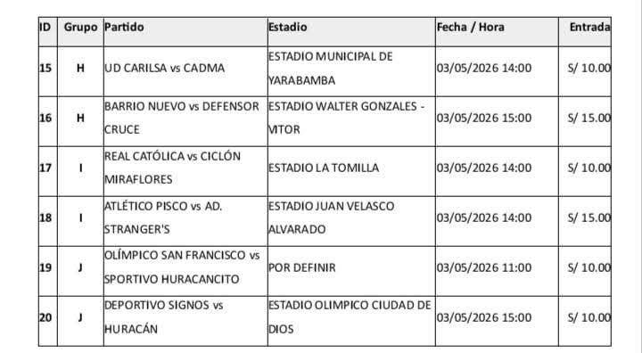La tercera fase se desarrollará en duelos únicos en el estadio La Tomilla, ubicado en el distrito de Cayma. Serán cinco partidos eliminatorios programados para el 30 y 31 de mayo. En caso de empate en el tiempo reglamentario, la clasificación se definirá directamente mediante tanda de penales. Solo cinco equipos quedarán en competencia tras esta instancia.
