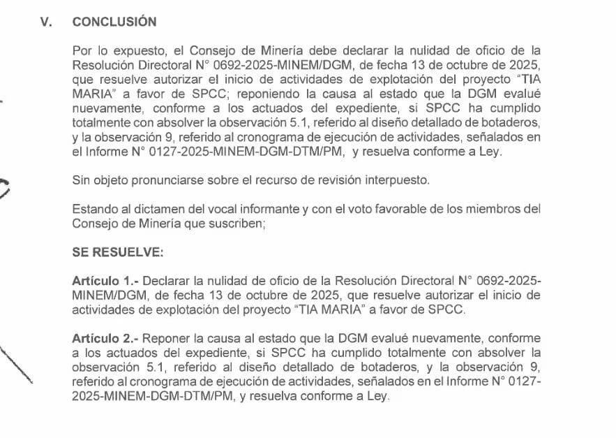 “Mediante Resolución N° 236-2026-MINEM/CM (19 de marzo del 2026), el Consejo de Minería del Perú declaró la nulidad de oficio de la Resolución Directoral N° 0692-2025-MINEM/DGM (13 de octubre del 2025), que autorizó el inicio de actividades de explotación del proyecto Tía María, a favor de la empresa Southern Peru Copper Corporation, abriendo paso a una nueva evaluación y reforzando la solidez del proceso”, se lee en el documento.