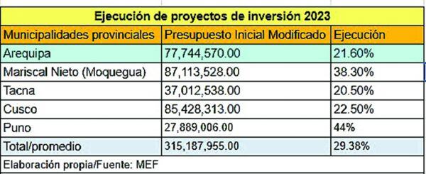 Seis meses sin avances claros. El portal de transparencia del Ministerio de Economía y Finanzas (MEF) revela que la Municipalidad Provincial de Arequipa (MPA) se ubica en el cuarto lugar de las municipalidades provinciales del sur del país, respecto a la ejecución de proyectos de inversión.