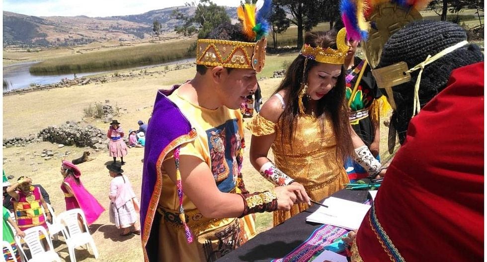 BODA. Arango inició la ceremonia e interpretó el código civil en quechua y castellano, con el quipu (escritura inca) y el acta de matrimonio en las manos. Luego, los esposos realizaron sus votos, jurándose amor eterno y regresar al Intihuatana en cada aniversario de bodas.