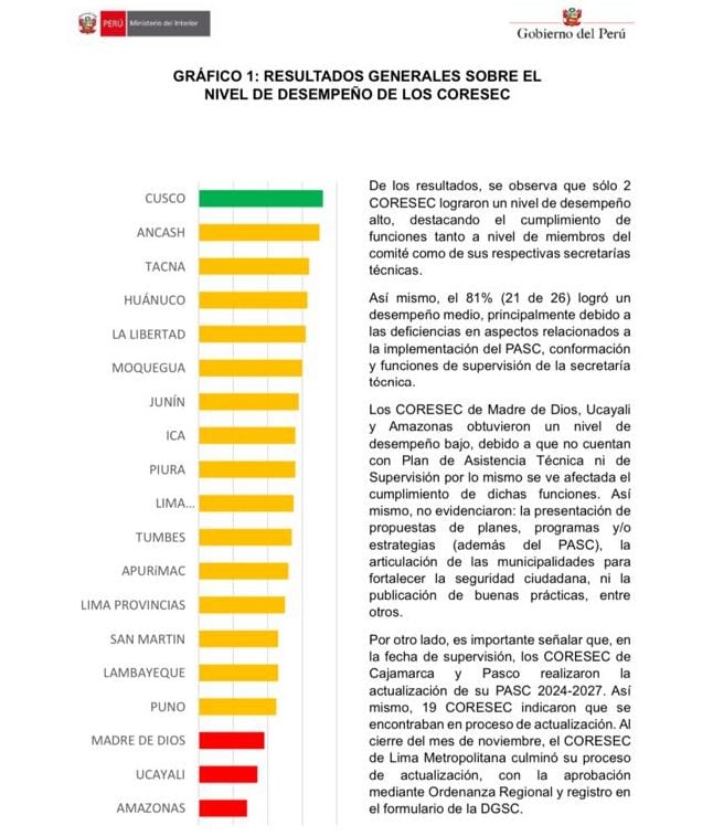 De acuerdo con el informe, solo dos regiones del país alcanzaron el nivel de desempeño alto, lo que posicionaría a Cusco como un ejemplo de buena gestión, cumplimiento de funciones y adecuado acompañamiento técnico, lo que evidencia una planificación efectiva y una activa supervisión de la secretaría técnica del Coresec.