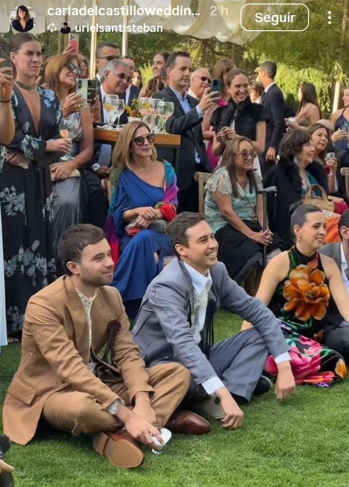 En estas imágenes se ve a los recién casados vestir ternos de color plomo y marrón, también se los ve bastante relajados, sentados en el césped junto a sus invitados, disfrutando de la música y comida.