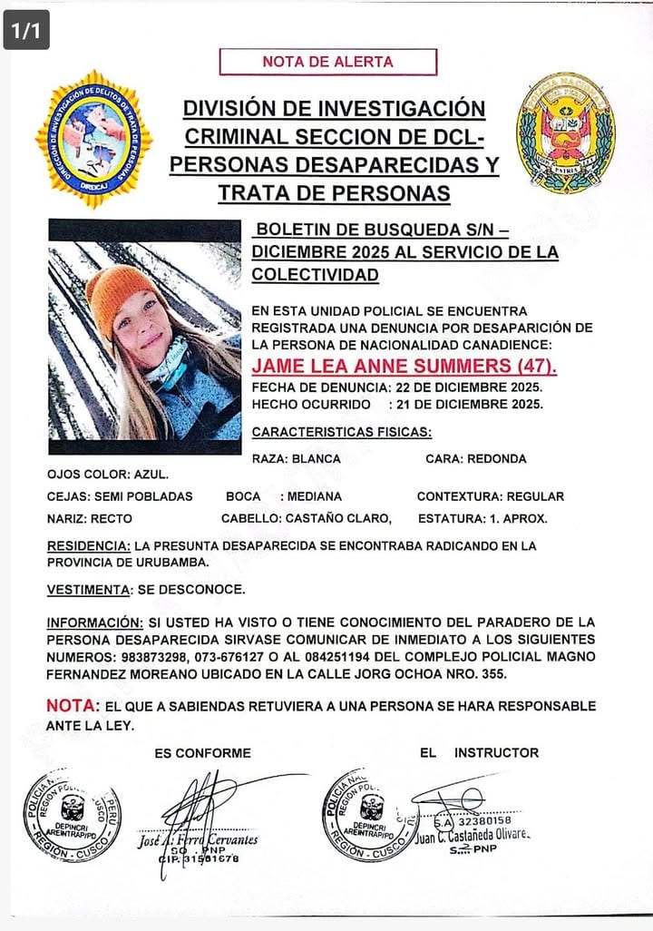 Es así que la Policía activó la alerta de búsqueda a nombre de la visitante canadiense, Jame Lee Anne Summers (47), quien fue vista la última vez por inmediaciones de la comunidad de Yanahuara - Urubamba.