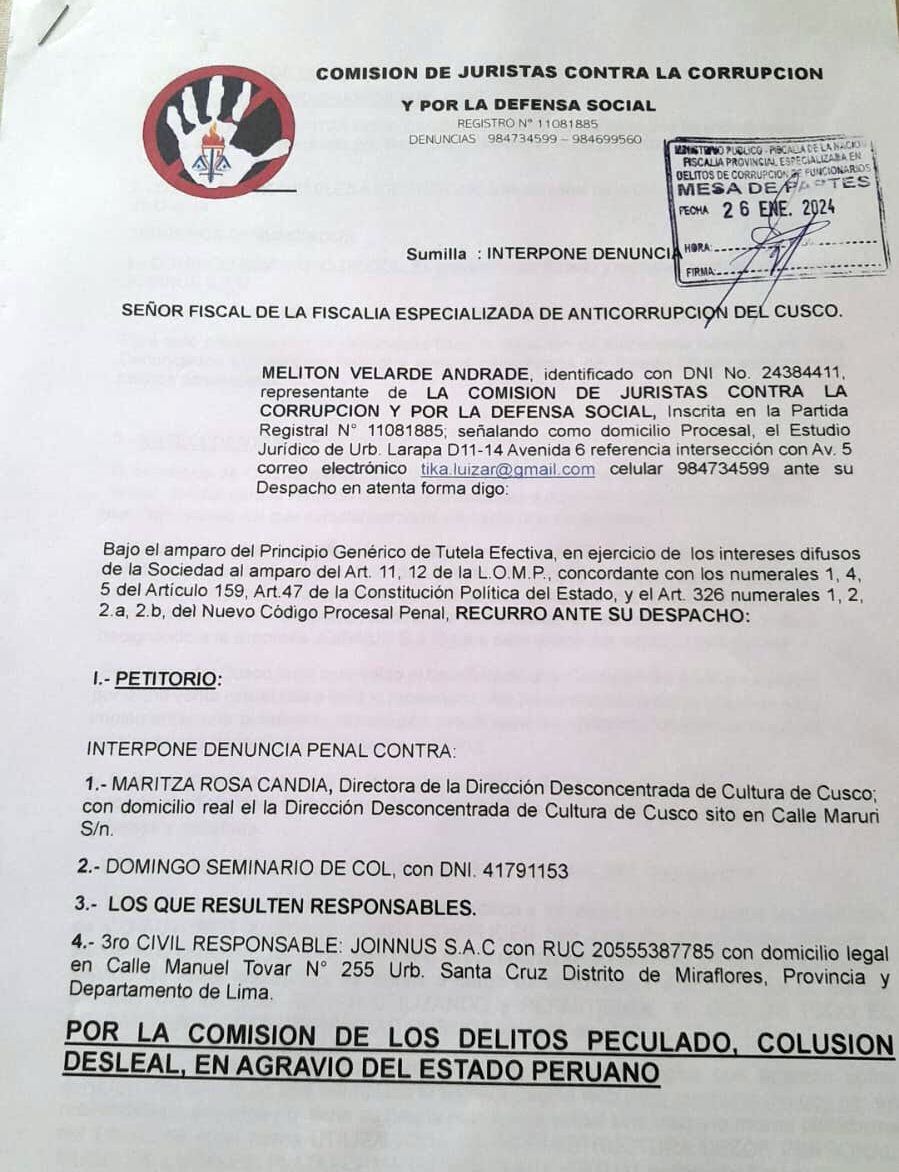 Según el Registro N°1181685 de la citada comisión, su representante, Meliton Carbajal, se dirige al titular de la Fiscalía Especializada Anticorrupción de Cusco, a fin de hacer un petitorio de denuncia penal contra la Dirección Desconcentrada de Cultura del Cusco, contra la empresa Joinnus y contra los que resulten responsables por la venta de entradas a Machu Picchu bajo un nuevo sistema.