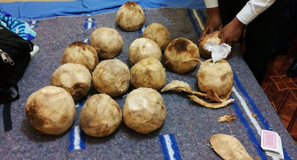 Durante el registro hallaron la droga hábilmente camuflada dentro de 14 frutas de coco, la misma que estaba envuelta en plástico transparente conteniendo una sustancia pastosa blanquecina.
