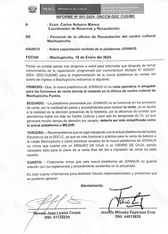 En medio de las constantes quejas y reclamos contra el nuevo sistema de venta de boletos para Machu Picchu, instaurado por el Ministerio de Cultura a través de Joinnus, el personal encargado de taquilla de la Dirección Desconcentrada de Cultura de Cusco, emite documento de queja contra el nuevo sistema.