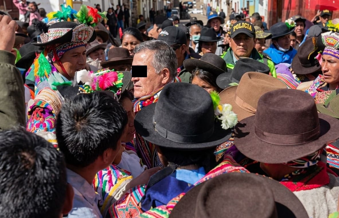 Según las redes sociales, mientras el fiscal provincial hablaba ante la muchedumbre, una mujeres aprovecharon ponerle una lliclla, una pollera y un chaleco con los que le obligaron a caminar por las calles de Lircay.