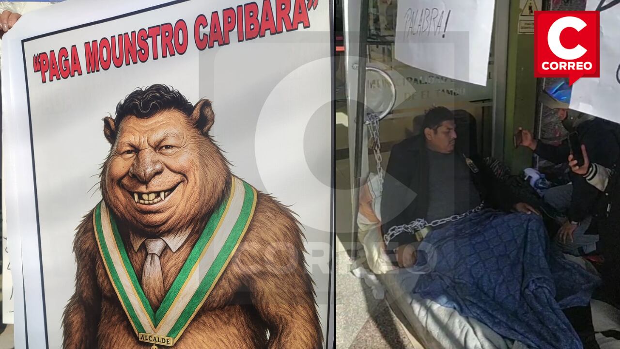 La manifestación incluyó la presencia simbólica de un burro y un cartel donde se representa al alcalde César Llalllico como un capibara, acompañado del mensaje: “Paga, monstruo capibara”.