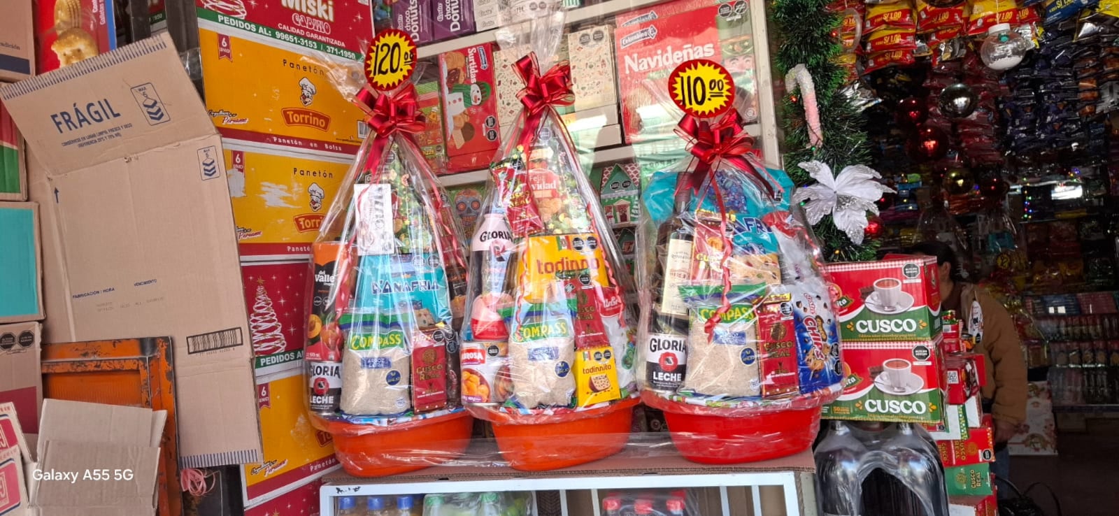 “Tenemos canastas navideñas desde 70 soles hasta 120 soles, de acuerdo a la cantidad de productos que contengan, las ventas se incrementan la primera semana de diciembre porque las empresas tienen que cumplir con los aguinaldos”, dijo el comerciante Jorge Castro de la confitería El Goloso de la cuadra 12 del jirón Huancas.