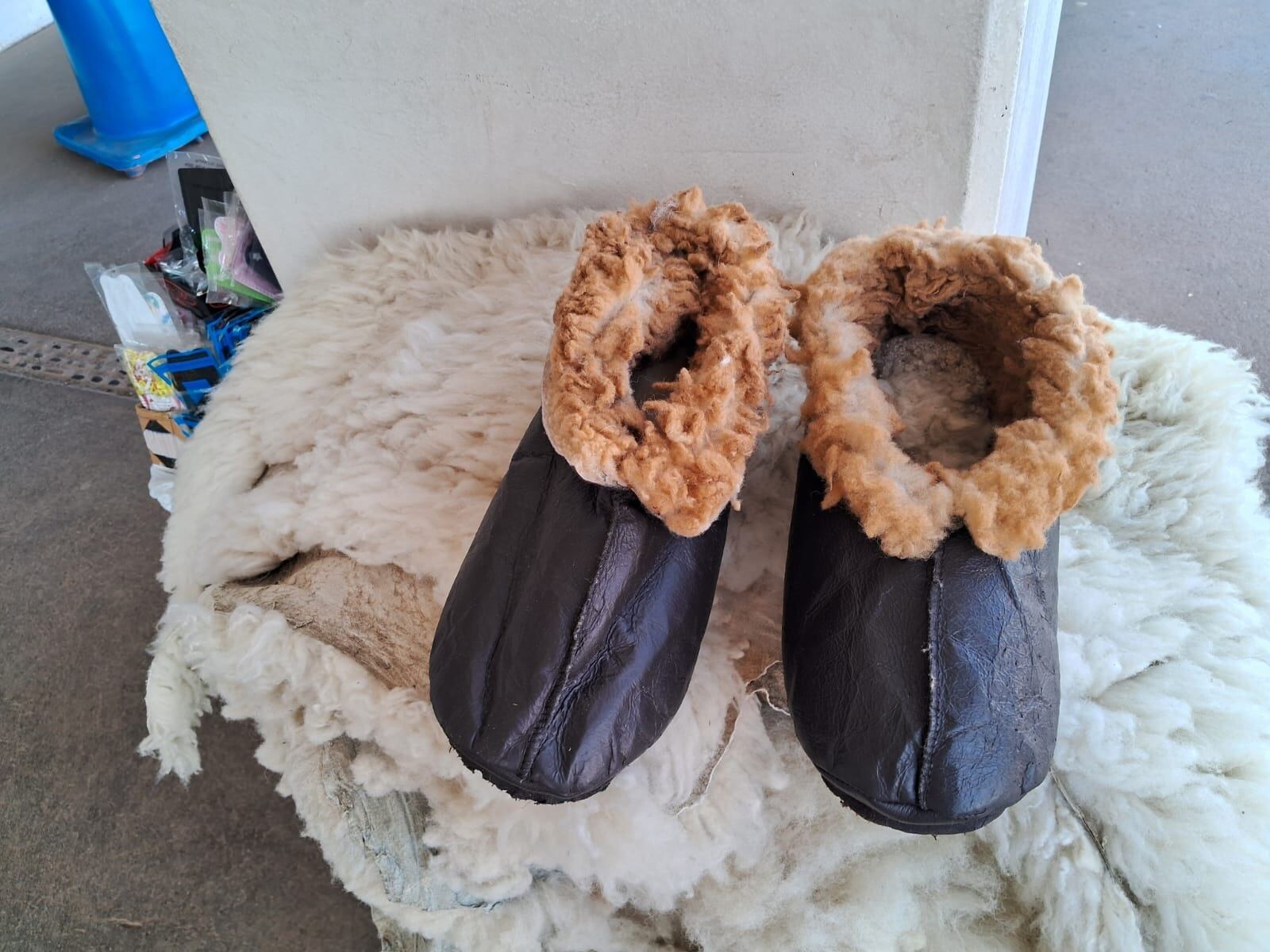”Para elaborar estos zapatos, compró los pellejos de la ganadería de altura, luego los curtimos y lo pasamos por la máquina peletera, se modela en una horma, se pega la plantilla y están listos para abrigar los pies”, mencionó.