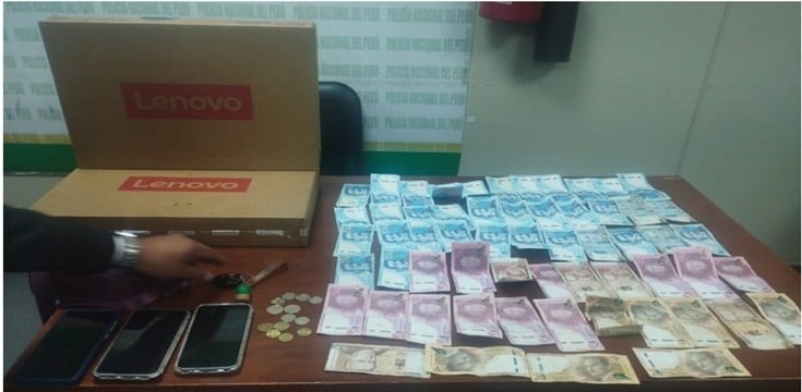 Y en el parque Peñaloza de Chilca, detuvieron a Ayde Tacunan Ojeda (41) y Edgar Álvarez Gómez (45). Además se incautó 4 mil 430 soles. Tres personas son investigadas por presunta estafa agravada y receptación.