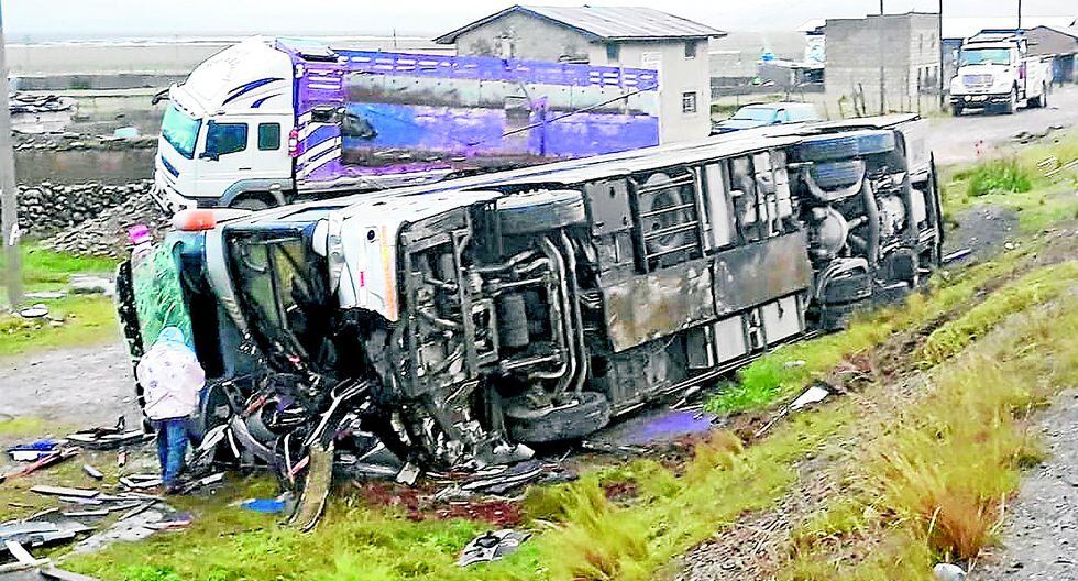 El bus chocó la parte trasera de un camión que cargaba animales y estaba estacionado en el sector de Callahua. El bus quedó volteado en la pista mientras el camión a un costado.